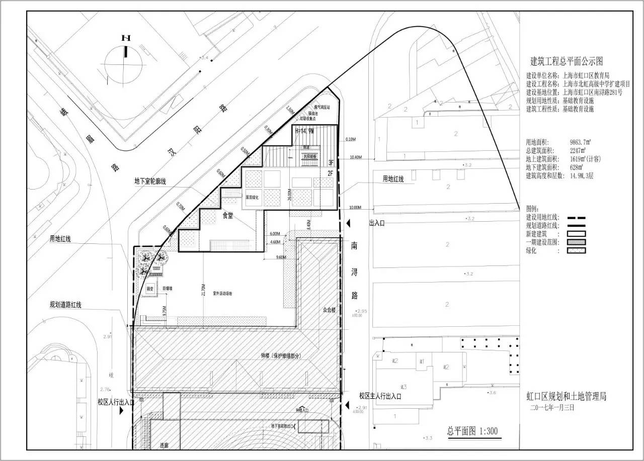 本次項目為北虹高級中學改擴建辦公樓,位于上海市南潯路281號。用地面積:9863.7平方米,建筑面積:2247平方米,其中地上1619平方米(全計容)、地下628平方米,建筑高度、層數:14.9米、3層。