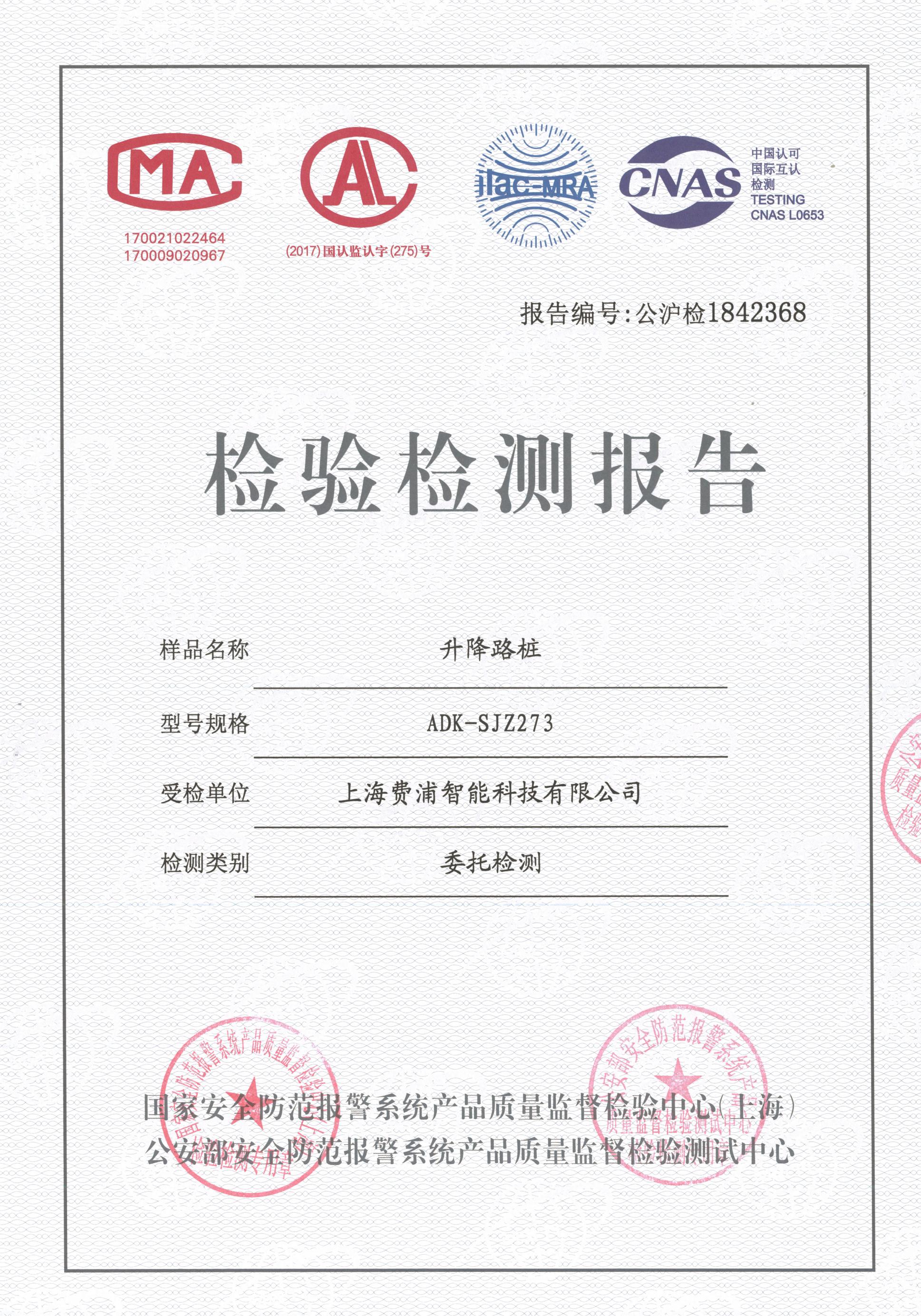 日前,隸屬于公安部第三研究所的國家安全防范報警系統產品質量檢測監督中心(上海)、公安部安全防范報警系統產品質量監督檢驗測試中心公布了對全自動液壓升降路樁(ADK-SJZ273)的檢驗結果,三所從產品外觀、產品質量、環境適應性、防護要求、緊急功能等11個檢測項目入手,檢驗受測產品的性能是否符合技術要求,以確保受檢測產品在交付應用中的專業性、可靠性、安全性。經嚴格的技術審核及檢測,全部符合國家標準及上海市地方安防標準,有多項指標高于國家標準及地方標準,獲得了公安三所頒發的《檢驗檢測報告》。