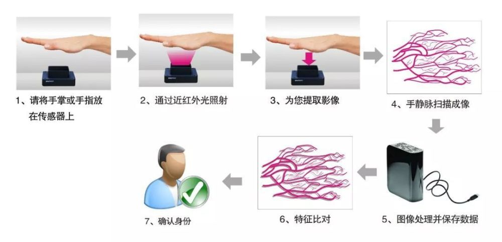 由于掌靜脈工作原理是依據人類身體中流動的血液可吸收特定波長的光波的特性,將特定波長的光波照射人體手掌,獲得靜脈血管的清晰圖像。此外,靜脈圖案是人體皮膚下的血管網絡結構,在自然光照條件條件下肉眼幾乎不可見,只有使用紅外照明時才能從體內獲得,所以無論是竊取還是偽造掌靜脈信息都變得非常困難。