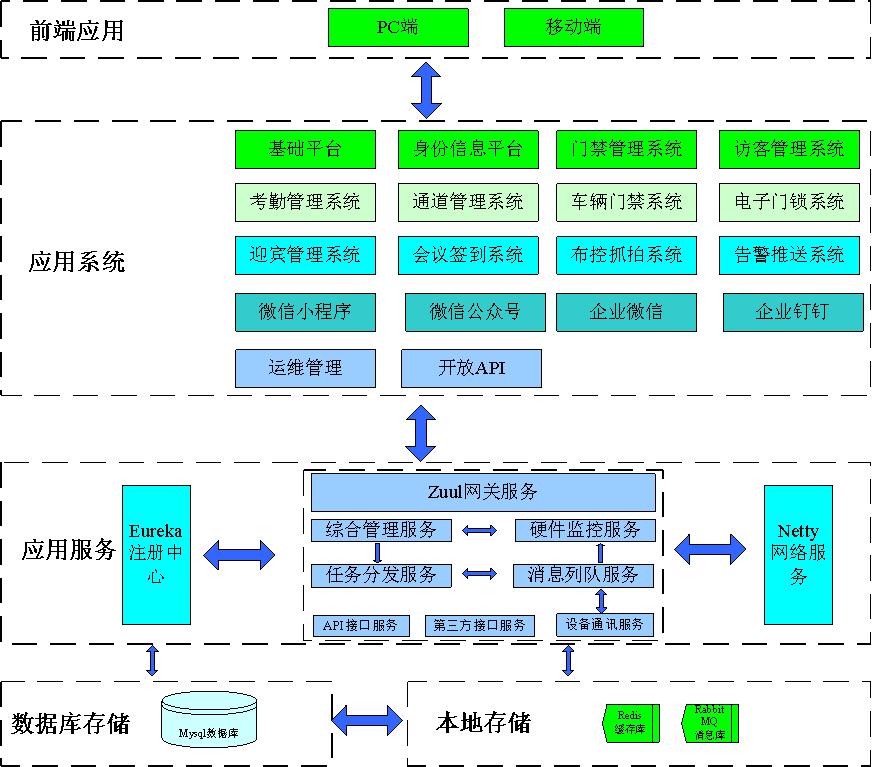 系統采用目前流行的、先進的spring cloud微服務架構,各業務平臺作為微服務注冊到服務中心后獲取相關的業務指令,服務與服務之間通過netty消息隊列,redis緩存技術進行通信,實現了業務的解耦,方便客戶根據需要訂制所需的業務功能,具有良好的開放性和擴展性。